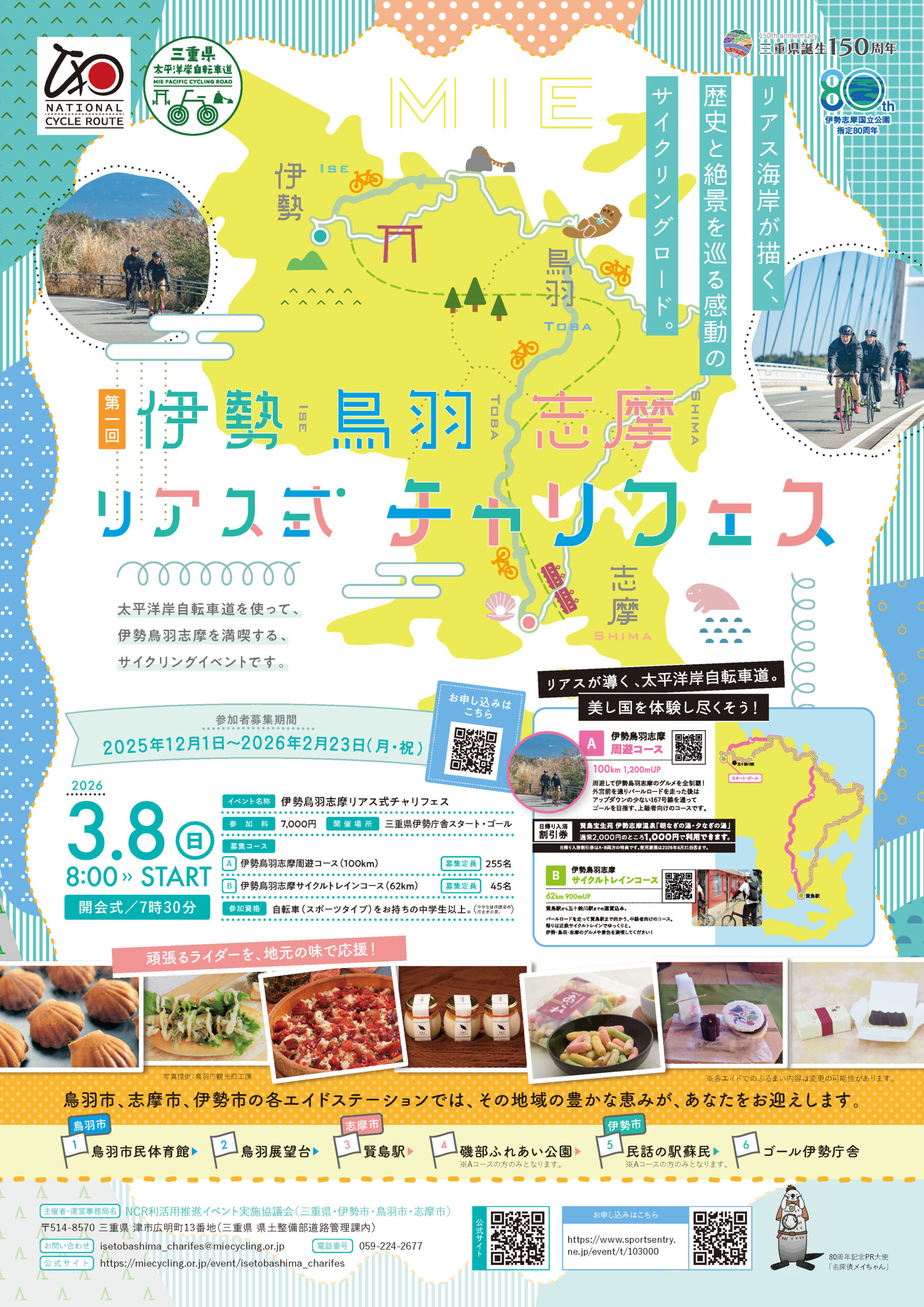 2026年3月8日に開催の「第1回 伊勢鳥羽志摩リアス式チャリフェス」のBコース(伊勢鳥羽志摩 サイクルトレインコース)の受付が定員につき、募集を終了しました。申し込みありがとうございました。