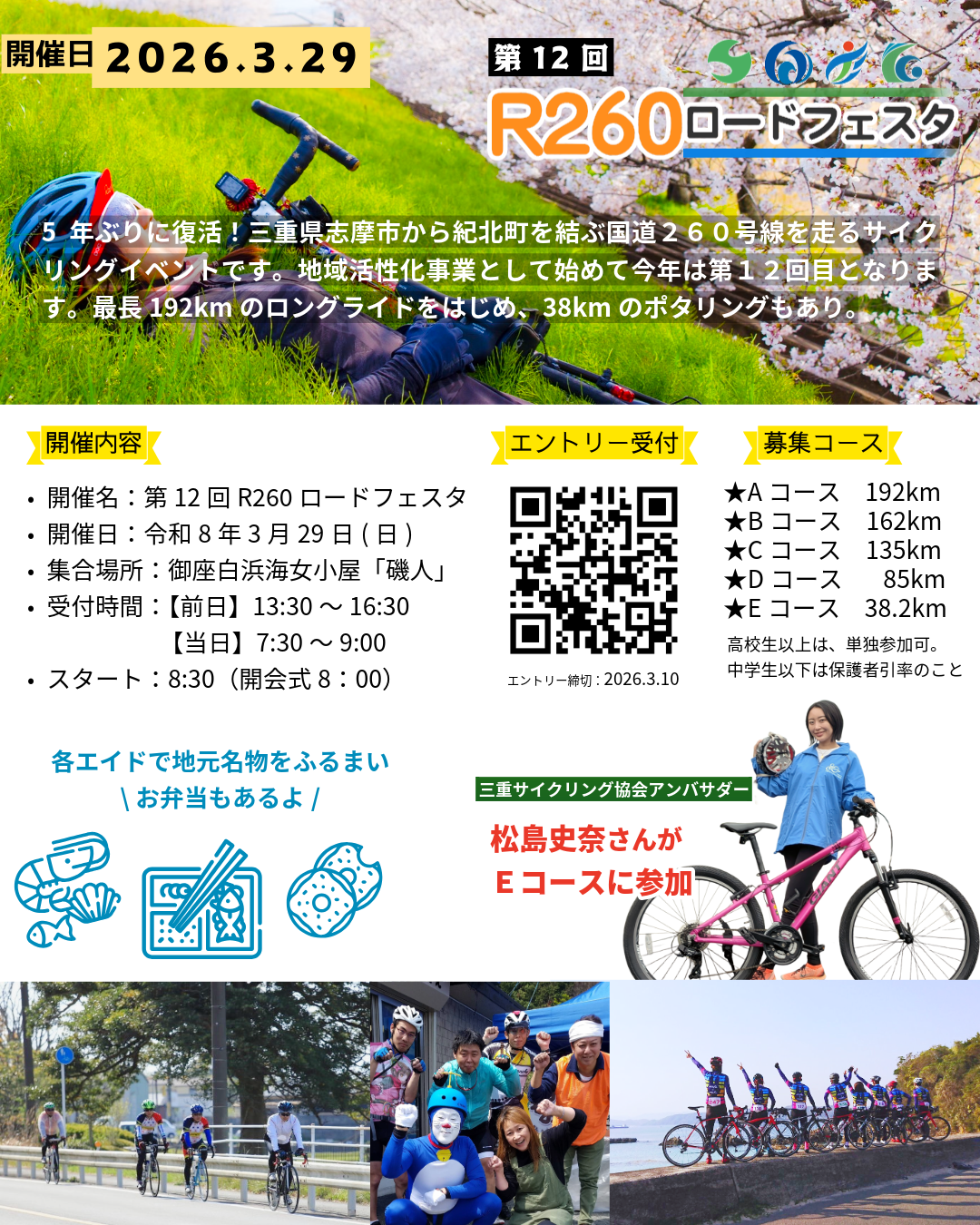 5年ぶりに復活!三重県志摩市から紀北町を結ぶ国道260号線を走るサイクリングイベント「R260ロードフェスタ」が2026年3月29日(日)に開催されます。